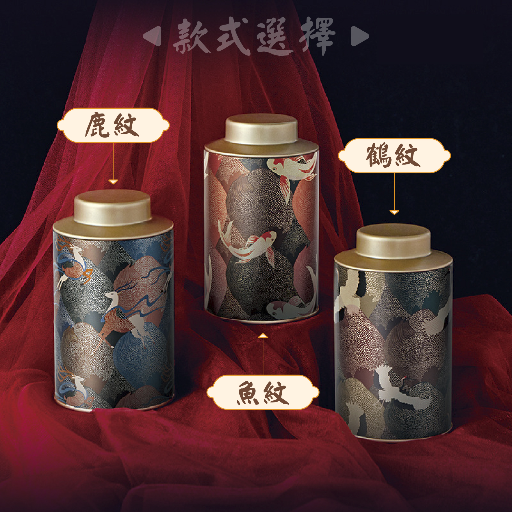 鶴紋、魚紋、鹿紋、白紅、綠、咖