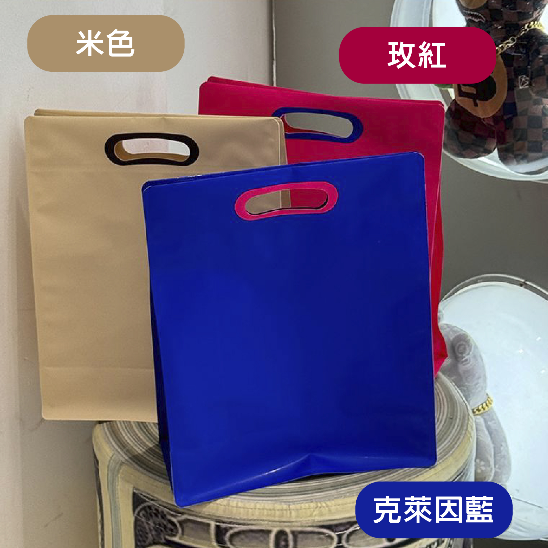克萊因藍、玫紅、米色